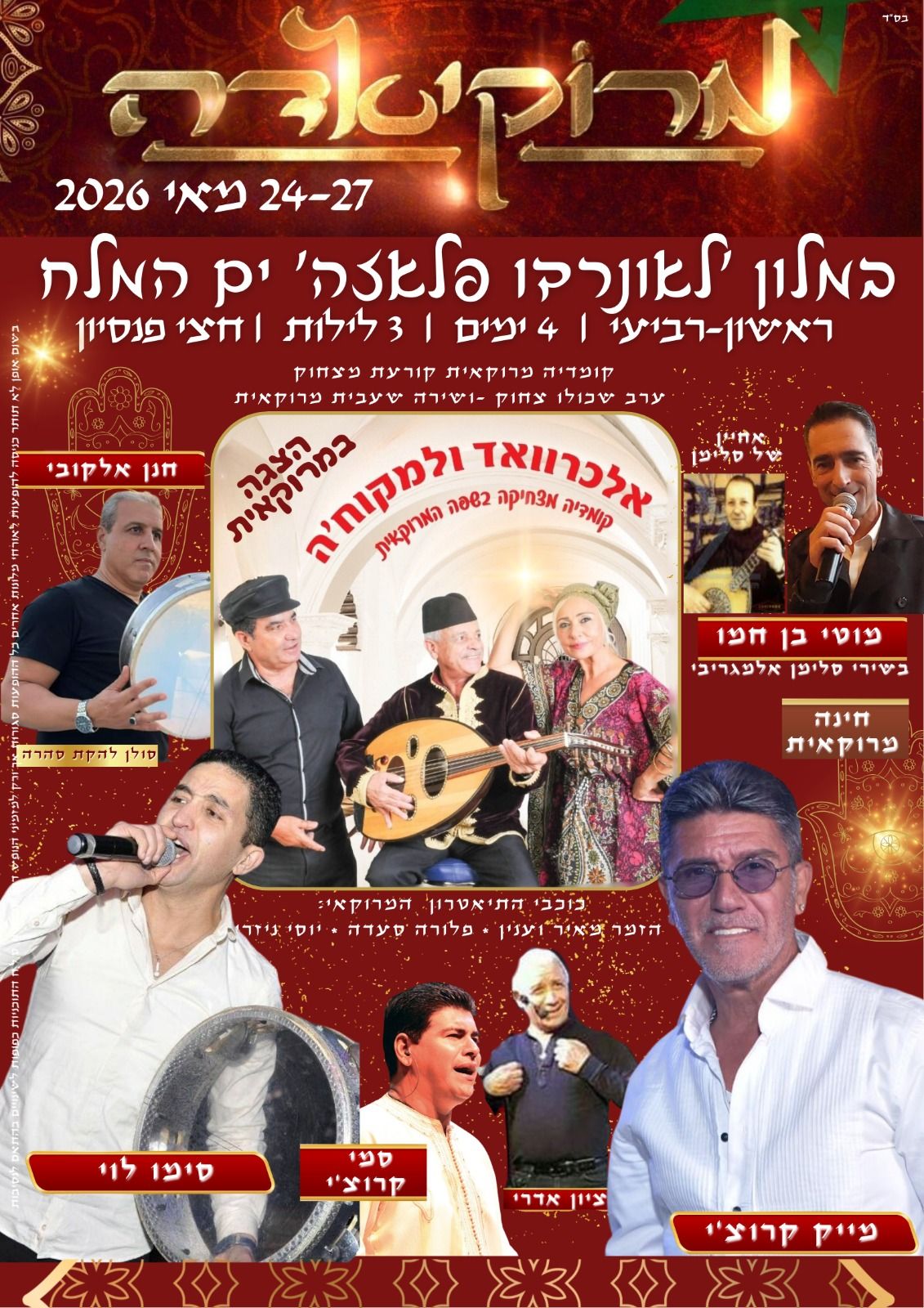הצטרפו אלינו לחופשה שכולה צבעים, טעמים וצלילים מהמסורת המרוקאית המפוארת. 3 לילות במקום הכי נמוך בעולם! 🎭🍷 📅 מתי זה קורה? 24-27 במאי, 2026 (ימים ראשון עד רביעי) 🏨 איפה מתארחים? במלון לאונרדו פלאזה ים המלח – ** מבצע להזמנות חדשות ועד גמר המלאי - כל הקודם זוכה - החברה רשאית לעצור/לבטל את המבצע בכל עת וללא הודעה מוקדמת .
